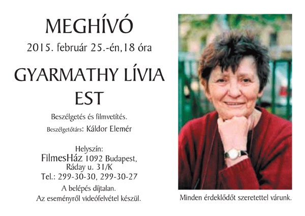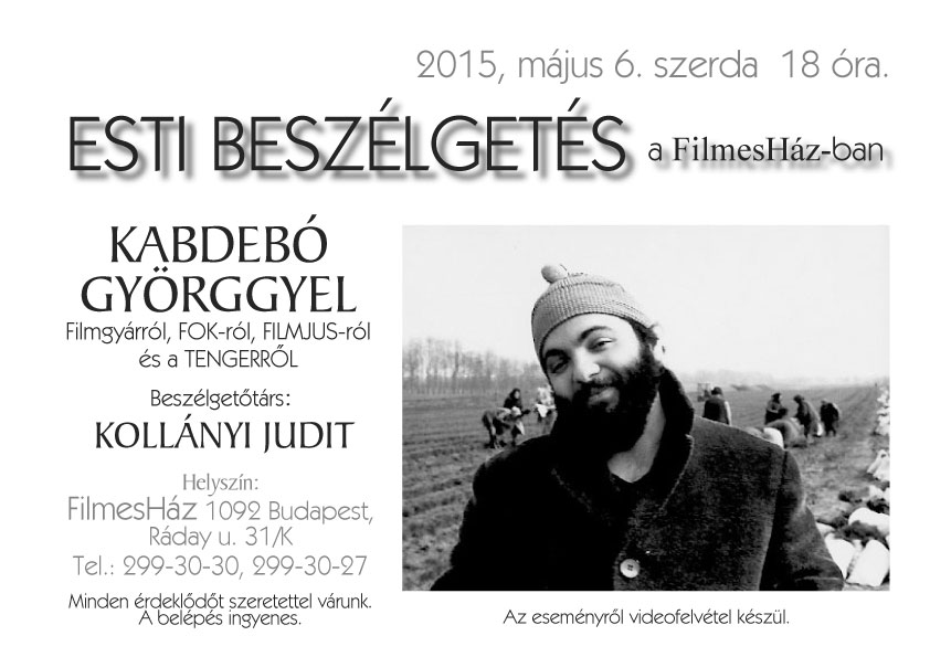 2015. első félévi programok a FilmesHázbanBeszélgetés Kabdebó Györggyel Filmgyárról, FOK-ról, FilmJUS-ról, tengerről 2015.05.06. 18:00