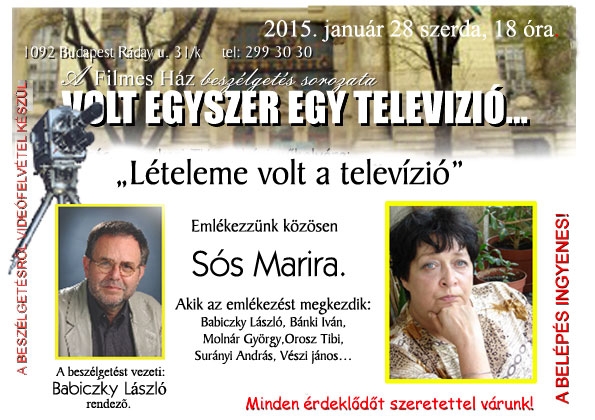 2015. első félévi programok a FilmesHázban„Lételeme volt a televízió”; emlékezés Sós Marira2015.01.28. 18:00