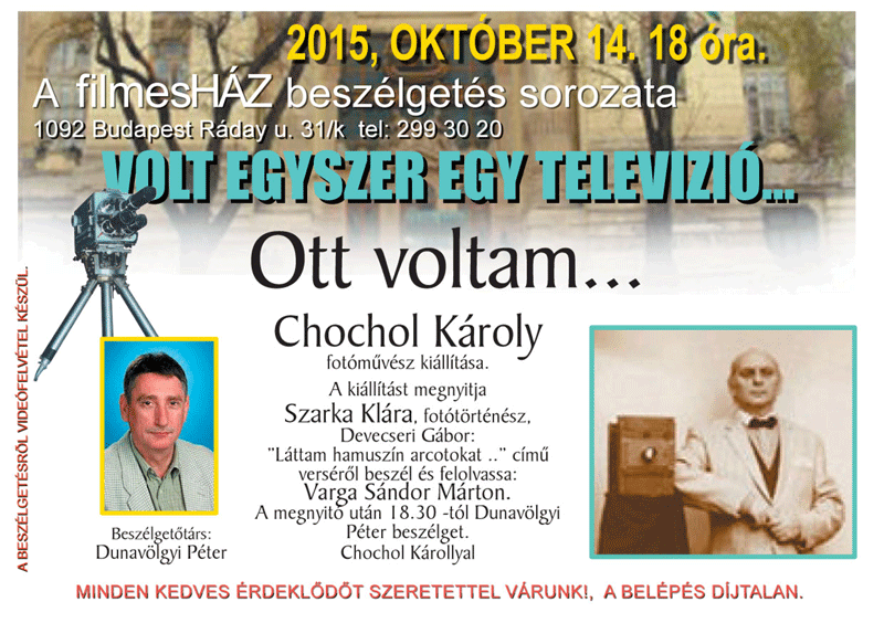 2015. második félévi programok a FilmesHázbanKiállítás-megnyitó és beszélgetés Chochol Károly fotóművésszel2015.10.14. 18:00