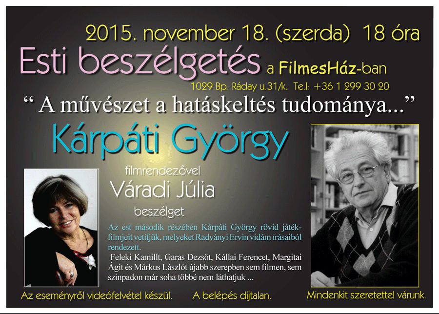 2015. második félévi programok a FilmesHázbanMűvészet és hatáskeltés; beszélgetés Dr. Kárpáti Györggyel 2015.11.18. 18:00