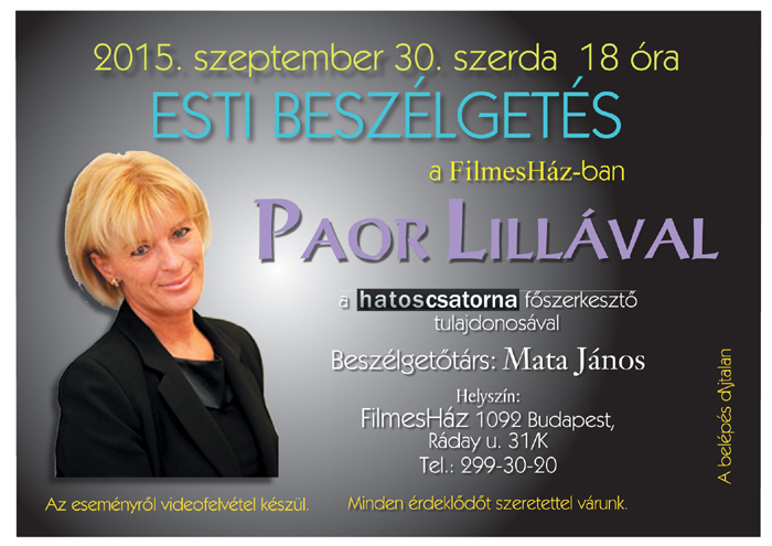 2015. második félévi programok a FilmesHázbanEsti beszélgetés Paor Lillával (hatoscsatorna, szerkesztő & tulajdonos)2015.09.30. 18:00