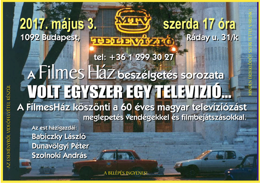 2017. első félévi programok a FilmesHázbanA FilmesHáz köszönti a 60 éves magyar televíziózást2017.05.03. 17:00