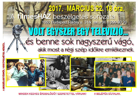 2017. első félévi programok a FilmesHázbanVolt egyszer egy televízió… és benne sok nagyszerű vágó, akik a régi szép időkre emlékeznek.2017.03.22. 18:00